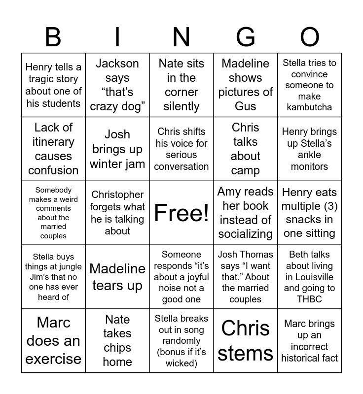 This bingo card has a free space and 29 words: Marc does an exercise, Henry cracks all his body parts, Christopher forgets what he is talking about, Henry says “actually” and corrects somebody, Henry tells a tragic story about one of his students, Nate sits in the corner silently, Josh brings up winter jam, Madeline tears up, Amy reads her book instead of socializing, Nate takes chips home, Henry eats multiple (3) snacks in one sitting, Marc brings up an incorrect historical fact, Stella breaks out in song randomly (bonus if it’s wicked), Chris stems, Henry brings up Stella’s ankle monitors, During worship Josh Thomas comments on his singing ability, Someone responds “it’s about a joyful noise not a good one, Stella buys things at jungle Jim’s that no one has ever heard of, Stella tries to convince someone to make kambutcha, Somebody makes a weird comments about the married couples, Josh Thomas says “I want that.” About the married couples, Josh Thomas develops a crush over the weekend, Chris talks about camp, Lack of itinerary causes confusion, Madeline shows pictures of Gus, Jackson says “that’s crazy dog”, Beth talks about living in Louisville and going to THBC, Chris shifts his voice for serious conversation and Steaks aren’t good.