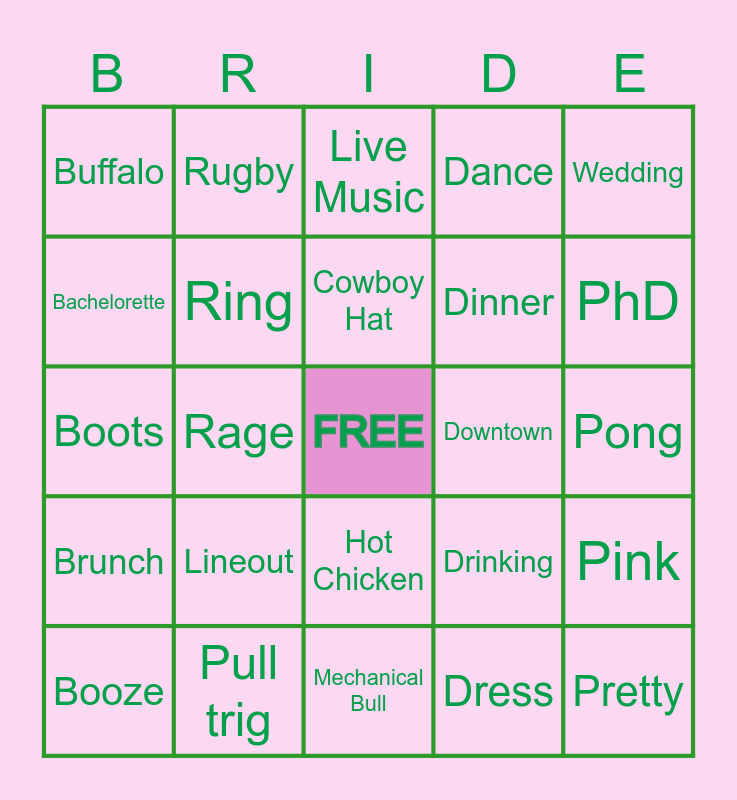 This bingo card has a free space and 34 words: Bride, Ride, Honky Tonk, Dartmouth, Pong, Bachelorette, Ring, Mechanical Bull, Dinner, Pretty, Boots, Rugby, Dress, Picture, Brunch, Rage, Hot Chicken, Downtown, Pink, Booze, Pull trig, Country, Dance, PhD, Bar, Lineout, Live Music, Bottoms, Wedding, Buffalo, Barbecue, Cowboy Hat, Drinking and Green.