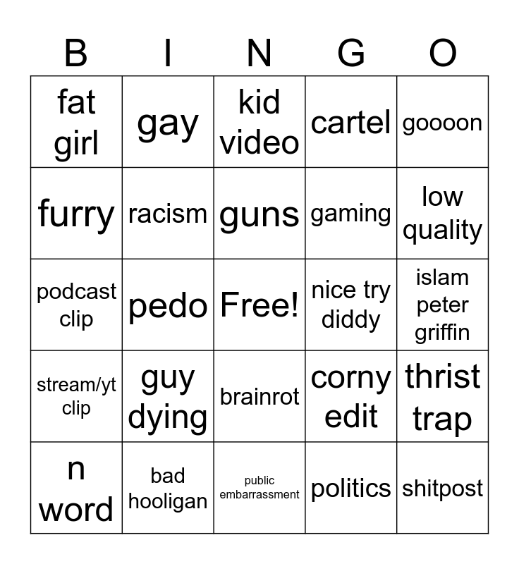 This bingo card has a free space and 24 words: guy dying, bad hooligan, guns, n word, goooon, fat girl, furry, gay, nice try diddy, brainrot, gaming, podcast clip, corny edit, thrist trap, racism, politics, islam peter griffin, kid video, low quality, pedo, shitpost, stream/yt clip, cartel and public embarrassment.
