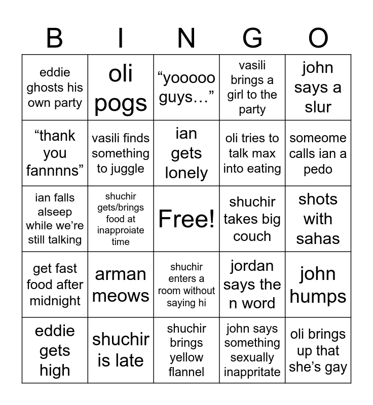 This bingo card has a free space and 24 words: arman meows, shuchir is late, ian gets lonely, eddie gets high, john says a slur, eddie ghosts his own party, “thank you fannnns”, oli pogs, shuchir takes big couch, shuchir enters a room without saying hi, oli tries to talk max into eating, ian falls alseep while we’re still talking, jordan says the n word, john humps, vasili finds something to juggle, john says something sexually inappritate, shots with sahas, “yooooo guys…”, someome calls ian a pedo, shuchir gets/brings food at inapproiate time, oli brings up that she’s gay, get fast food after midnight, vasili brings a girl to the party and shuchir brings yellow flannel.