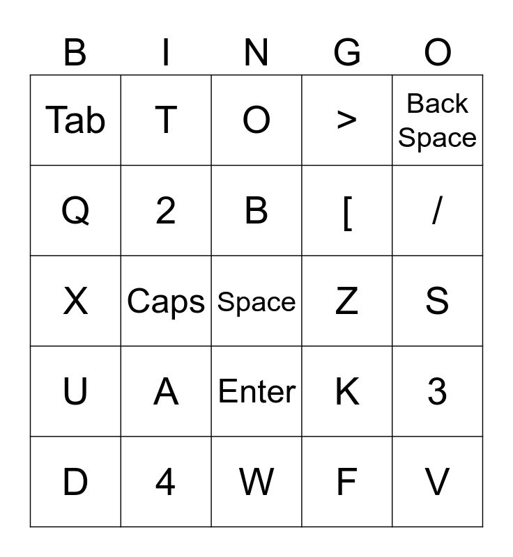 This bingo card has a free space and 24 words: A, 4, B, D, Back Space, Tab, Q, T, Z, Enter, [, X, K, 3, 2, F, S, O, /, Caps, V, U, > and W.