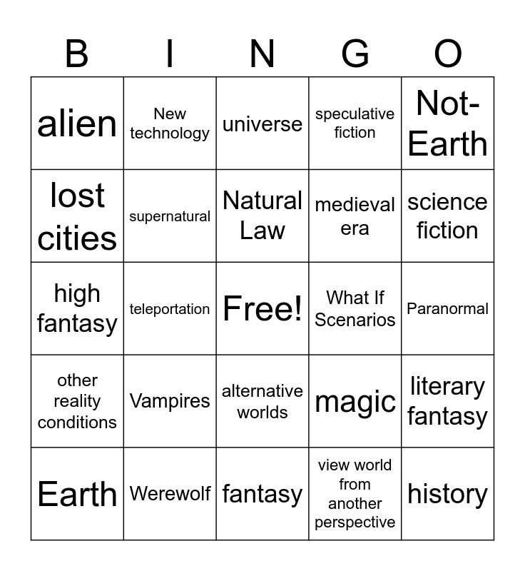 This bingo card has a free space and 24 words: Vampires, Werewolf, Natural Law, Earth, Not-Earth, alien, lost cities, New technology, What If Scenarios, alternative worlds, medieval era, high fantasy, magic, literary fantasy, supernatural, view world from another perspective, Paranormal, universe, science fiction, teleportation, history, other reality conditions, speculative fiction and fantasy.