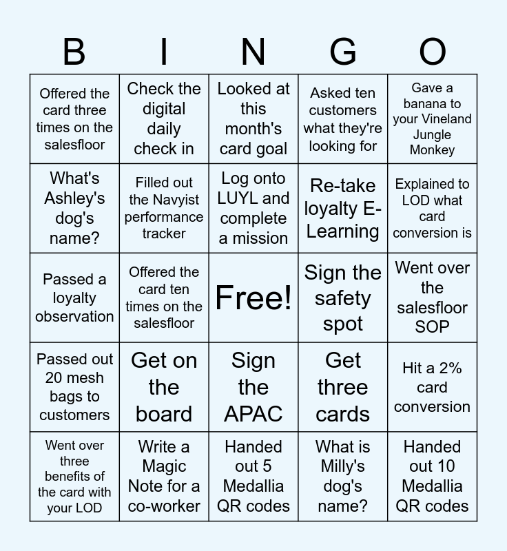 This bingo card has a free space and 24 words: Get on the board, Write a Magic Note for a co-worker, Log onto LUYL and complete a mission, Went over three benefits of the card with your LOD, Gave a banana to your Vineland Jungle Monkey, Offered the card three times on the salesfloor, What's Ashley's dog's name?, Check the digital daily check in, Sign the safety spot, Sign the APAC, Re-take loyalty E-Learning, Passed a loyalty observation, Get three cards, Hit a 2% card conversion, Filled out the Navyist performance tracker, What is Milly's dog's name?, Went over the salesfloor SOP, Looked at this month's card goal, Explained to LOD what card conversion is, Offered the card ten times on the salesfloor, Handed out 10 Medallia QR codes, Passed out 20 mesh bags to customers, Asked ten customers what they're looking for and Handed out 5 Medallia QR codes.