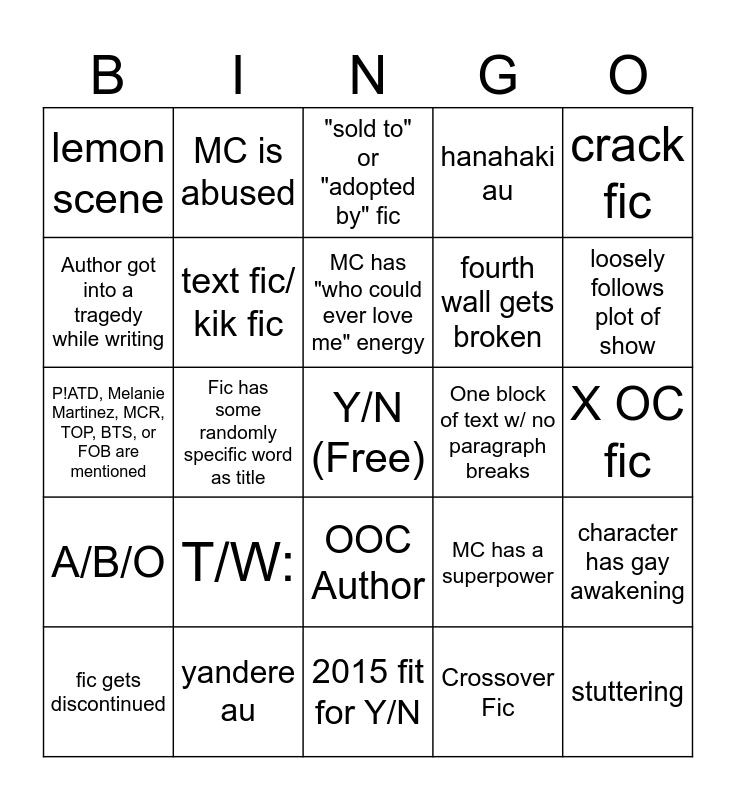 This bingo card has a free space and 24 words: T/W:, yandere au, MC has "who could ever love me" energy, fic gets discontinued, crack fic, lemon scene, Author got into a tragedy while writing, MC is abused, One block of text w/ no paragraph breaks, OOC Author, fourth wall gets broken, P!ATD, Melanie Martinez, MCR, TOP, BTS, or FOB are mentioned, MC has a superpower, character has gay awakening, text fic/ kik fic, Crossover Fic, X OC fic, "sold to" or "adopted by" fic, loosely follows plot of show, Fic has some randomly specific word as title, stuttering, A/B/O, hanahaki au and 2015 fit for Y/N.