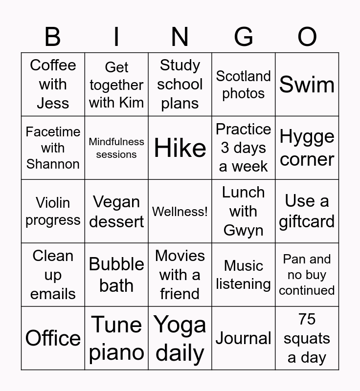 This bingo card has a free space and 24 words: Bubble bath, Tune piano, Hike, Office, Swim, Coffee with Jess, Facetime with Shannon, Get together with Kim, Lunch with Gwyn, Movies with a friend, Practice 3 days a week, Violin progress, Music listening, Pan and no buy continued, Mindfulness sessions, Journal, Use a giftcard, Study school plans, Hygge corner, Vegan dessert, 75 squats a day, Clean up emails, Scotland photos and Yoga daily.