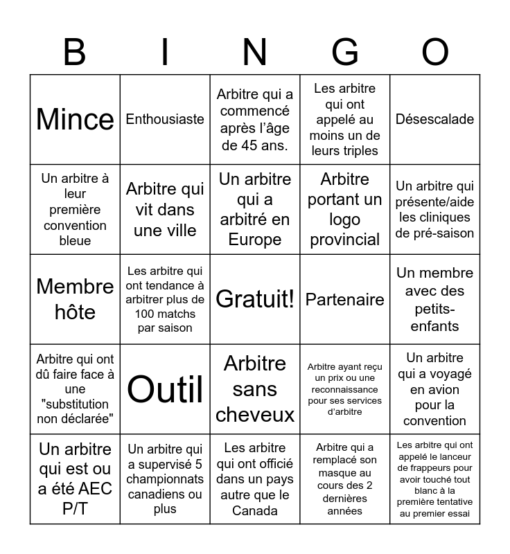 This bingo card has a free space and 24 words: Outil, Un arbitre qui a supervisé 5 championnats canadiens ou plus, Un arbitre qui a arbitré en Europe, Un arbitre qui est ou a été AEC P/T, Désescalade, Mince, Un arbitre à leur première convention bleue, Enthousiaste, Partenaire, Arbitre sans cheveux, Arbitre portant un logo provincial, Membre hôte, Arbitre ayant reçu un prix ou une reconnaissance pour ses services d’arbitre, Un arbitre qui a voyagé en avion pour la convention, Arbitre qui vit dans une ville, Arbitre qui a remplacé son masque au cours des 2 dernières années, Un membre avec des petits-enfants, Arbitre qui a commencé après l’âge de 45 ans., Un arbitre qui présente/aide les cliniques de pré-saison, Les arbitre qui ont tendance à arbitrer plus de 100 matchs par saison, Les arbitre qui ont appelé le lanceur de frappeurs pour avoir touché tout blanc à la première tentative au premier essai, Arbitre qui ont dû faire face à une "substitution non déclarée", Les arbitre qui ont appelé au moins un de leurs triples and Les arbitre qui ont officié dans un pays autre que le Canada.