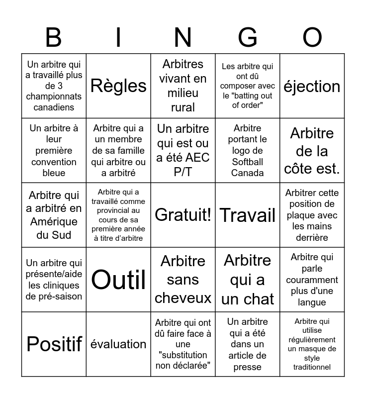 This bingo card has a free space and 24 words: Outil, évaluation, Un arbitre qui est ou a été AEC P/T, Positif, éjection, Un arbitre qui a travaillé plus de 3 championnats canadiens, Un arbitre à leur première convention bleue, Règles, Travail, Arbitre sans cheveux, Arbitre portant le logo de Softball Canada, Arbitre qui a arbitré en Amérique du Sud, Arbitre qui a un chat, Arbitre qui parle couramment plus d'une langue, Arbitre qui a un membre de sa famille qui arbitre ou a arbitré, Un arbitre qui a été dans un article de presse, Arbitrer cette position de plaque avec les mains derrière, Arbitres vivant en milieu rural, Arbitre de la côte est., Arbitre qui a travaillé comme provincial au cours de sa première année à titre d’arbitre, Arbitre qui utilise régulièrement un masque de style traditionnel, Un arbitre qui présente/aide les cliniques de pré-saison, Les arbitre qui ont dû composer avec le "batting out of order" and Arbitre qui ont dû faire face à une "substitution non déclarée".