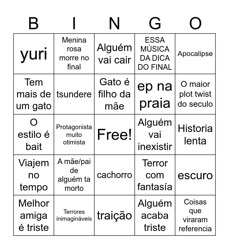 This bingo card has a free space and 24 words: A mãe/pai de alguém ta morto, Terrores inimagináveis, Gato é filho da mãe, Melhor amiga é triste, Apocalipse, yuri, Tem mais de um gato, Menina rosa morre no final, Alguém vai inexistir, cachorro, ep na praia, O estilo é bait, Terror com fantasía, escuro, tsundere, Alguém acaba triste, Historia lenta, Alguém vai cair, O maior plot twist do seculo, Protagonista muito otimista, Coisas que viraram referencia, Viajem no tempo, ESSA MÚSICA DA DICA DO FINAL and traição.