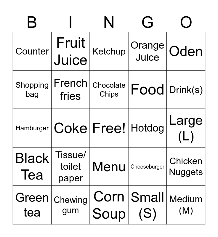 This bingo card has a free space and 24 words: Tissue/ toilet paper, Chewing gum, Chocolate Chips, Green tea, Oden, Counter, Shopping bag, Fruit Juice, Hotdog, Menu, Food, Hamburger, Cheeseburger, Chicken Nuggets, French fries, Small (S), Large (L), Ketchup, Drink(s), Coke, Medium (M), Black Tea, Orange Juice and Corn Soup.