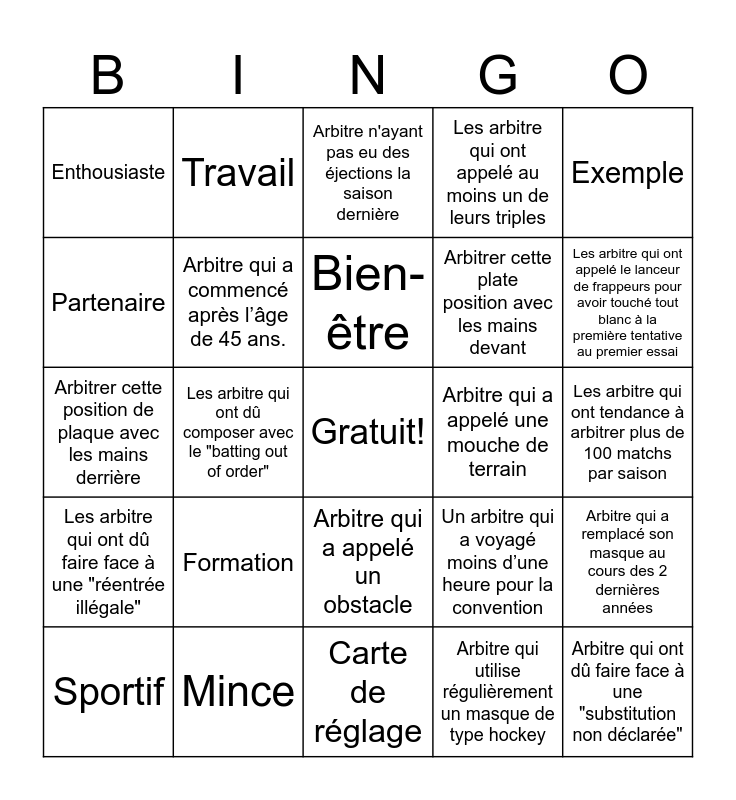 This bingo card has a free space and 24 words: Formation, Mince, Bien-être, Sportif, Exemple, Enthousiaste, Partenaire, Travail, Arbitre qui a appelé une mouche de terrain, Arbitre qui a appelé un obstacle, Arbitrer cette plate position avec les mains devant, Arbitrer cette position de plaque avec les mains derrière, Un arbitre qui a voyagé moins d’une heure pour la convention, Arbitre qui a remplacé son masque au cours des 2 dernières années, Arbitre qui a commencé après l’âge de 45 ans., Arbitre qui utilise régulièrement un masque de type hockey, Les arbitre qui ont tendance à arbitrer plus de 100 matchs par saison, Arbitre n'ayant pas eu des éjections la saison dernière, Les arbitre qui ont appelé le lanceur de frappeurs pour avoir touché tout blanc à la première tentative au premier essai, Les arbitre qui ont dû composer avec le "batting out of order", Arbitre qui ont dû faire face à une "substitution non déclarée", Les arbitre qui ont dû faire face à une "réentrée illégale", Les arbitre qui ont appelé au moins un de leurs triples and Carte de réglage.