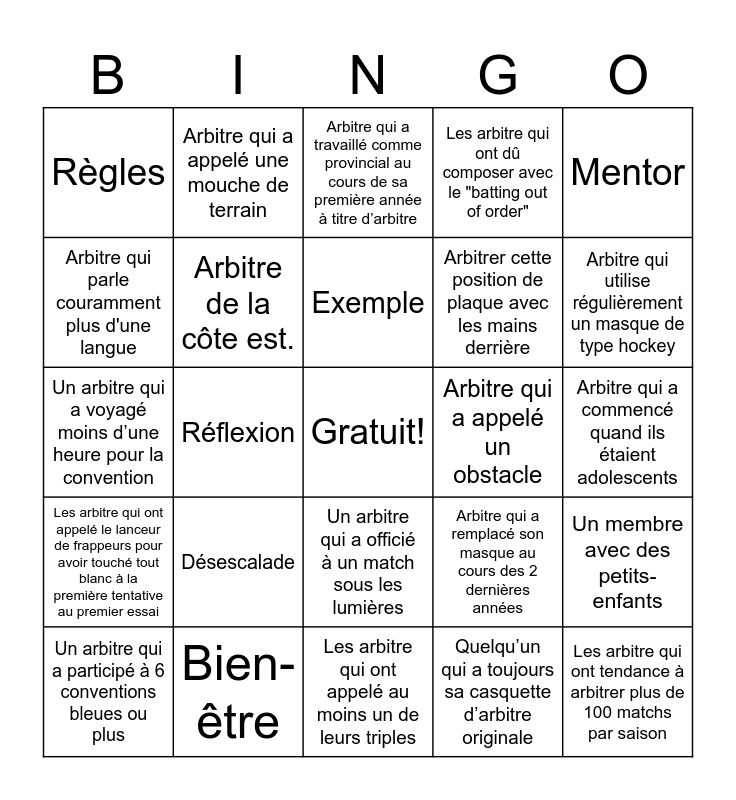 This bingo card has a free space and 24 words: Désescalade, Bien-être, Exemple, Un arbitre qui a participé à 6 conventions bleues ou plus, Mentor, Règles, Arbitre qui parle couramment plus d'une langue, Arbitre qui a appelé une mouche de terrain, Arbitre qui a appelé un obstacle, Un arbitre qui a officié à un match sous les lumières, Arbitrer cette position de plaque avec les mains derrière, Un arbitre qui a voyagé moins d’une heure pour la convention, Arbitre qui a remplacé son masque au cours des 2 dernières années, Un membre avec des petits-enfants, Arbitre de la côte est., Quelqu’un qui a toujours sa casquette d’arbitre originale, Arbitre qui a commencé quand ils étaient adolescents, Arbitre qui a travaillé comme provincial au cours de sa première année à titre d’arbitre, Arbitre qui utilise régulièrement un masque de type hockey, Réflexion, Les arbitre qui ont tendance à arbitrer plus de 100 matchs par saison, Les arbitre qui ont appelé le lanceur de frappeurs pour avoir touché tout blanc à la première tentative au premier essai, Les arbitre qui ont dû composer avec le "batting out of order" and Les arbitre qui ont appelé au moins un de leurs triples.