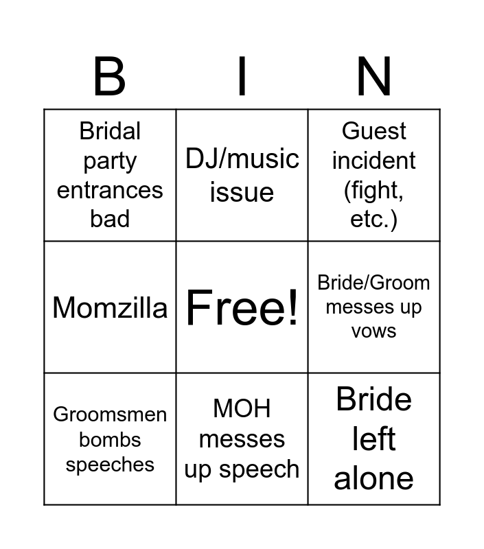 This bingo card has a free space and 11 words: Groom too drunk, MOH messes up speech, Bride left alone, Groomsmen bombs speeches, DJ/music issue, Guest incident (fight, etc.), Bride/Groom messes up vows, Vendor issue, Momzilla, Bridal party entrances bad and First dance terrible.