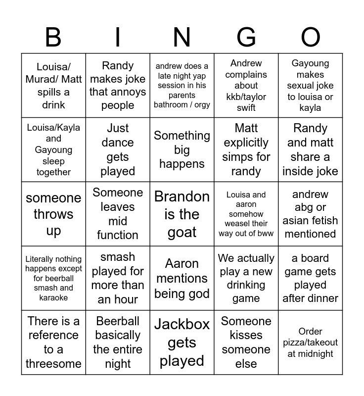 This bingo card has a free space and 24 words: smash played for more than an hour, Beerball basically the entire night, Something big happens, There is a reference to a threesome, Gayoung makes sexual joke to louisa or kayla, Louisa/ Murad/ Matt spills a drink, Louisa/Kayla and Gayoung sleep together, Randy makes joke that annoys people, Louisa and aaron somehow weasel their way out of bww, Aaron mentions being god, Matt explicitly simps for randy, someone throws up, We actually play a new drinking game, a board game gets played after dinner, Just dance gets played, Someone kisses someone else, andrew abg or asian fetish mentioned, andrew does a late night yap session in his parents bathroom / orgy, Randy and matt share a inside joke, Someone leaves mid function, Order pizza/takeout at midnight, Literally nothing happens except for beerball smash and karaoke, Andrew complains about kkb/taylor swift and Jackbox gets played.