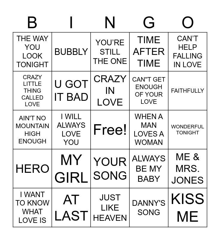 This bingo card has a free space and 24 words: MY GIRL, AT LAST, CRAZY IN LOVE, I WANT TO KNOW WHAT LOVE IS, CAN’T HELP FALLING IN LOVE, THE WAY YOU LOOK TONIGHT, CRAZY LITTLE THING CALLED LOVE, BUBBLY, WHEN A MAN LOVES A WOMAN, YOUR SONG, CAN''T GET ENOUGH OF YOUR LOVE, AIN'T NO MOUNTAIN HIGH ENOUGH, ALWAYS BE MY BABY, ME & MRS. JONES, U GOT IT BAD, DANNY'S SONG, WONDERFUL TONIGHT, YOU’RE STILL THE ONE, FAITHFULLY, I WILL ALWAYS LOVE YOU, KISS ME, HERO, TIME AFTER TIME and JUST LIKE HEAVEN.