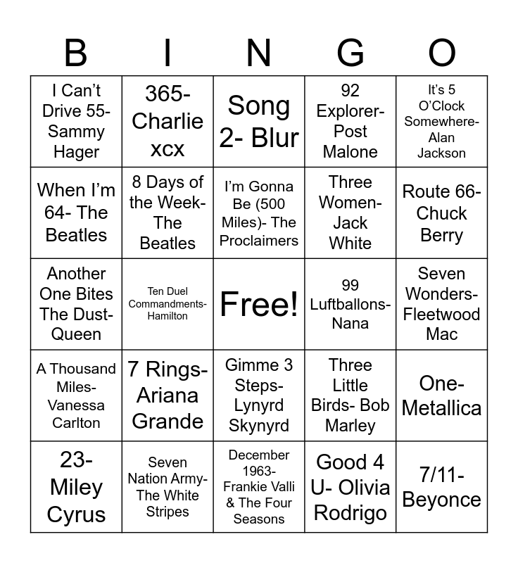 This bingo card has a free space and 52 words: 9 X’s Out of Ten- Invisible Man’s Band, 7/11- Beyonce, Season 2 Episode 3- Glass Animals, December 1963- Frankie Valli & The Four Seasons, 7 Rings- Ariana Grande, 911- Lady Gaga, 365- Charlie xcx, Welcome to the 60s- Nikki Blonsky, John Travolta, When I’m 64- The Beatles, 4x4- Miley Cyrus, 8 Days of the Week- The Beatles, One More Time- Daft Punk, One- Metallica, Three Little Birds- Bob Marley, 1999- Prince, 24k Magic- Bruno Mars, I’m Gonna Be (500 Miles)- The Proclaimers, 99 Luftballons- Nana, 6 Foot 7 Foot- Lil Wayne, It’s 5 O’Clock Somewhere- Alan Jackson, Ten Duel Commandments- Hamilton, Good 4 U- Olivia Rodrigo, I Can’t Drive 55- Sammy Hager, Three Women- Jack White, One Love- Bob Marley, 34+35- Ariana Grande, 4 Minutes-Madonna, Justin Timberlake, One More Night- Maroon 5, Route 66- Chuck Berry, Summer of ‘69, 679- Fetty Wap, 92 Explorer- Post Malone, 21 Reasons- Nathan Dawe, I2I- Tevin Campbell, One- Three Dog Night, Song 2- Blur, Seven Nation Army- The White Stripes, Five Minutes to Live- Johnny Cash, 2 Become 1- Spice Girls, One More Last Chance- Vince Gill, Edge of Seventeen- Stevie Nicks, Seven Wonders- Fleetwood Mac, A Thousand Miles- Vanessa Carlton, Two Princes- Spin Doctors, Gimme 3 Steps- Lynyrd Skynyrd, One of These Nights- Eagles, One Way Or Another- Blondie, Another One Bites The Dust- Queen, 1,2 Steps- Ciara, Missy Elliott, One Thing- One Direction, 23- Miley Cyrus and 867.5309/Jenny- Tommy Tutone.