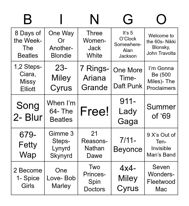 This bingo card has a free space and 52 words: Edge of Seventeen- Stevie Nicks, Seven Wonders- Fleetwood Mac, A Thousand Miles- Vanessa Carlton, Two Princes- Spin Doctors, Gimme 3 Steps- Lynyrd Skynyrd, One of These Nights- Eagles, One Way Or Another- Blondie, Another One Bites The Dust- Queen, 1,2 Steps- Ciara, Missy Elliott, One Thing- One Direction, 23- Miley Cyrus, 867.5309/Jenny- Tommy Tutone, 9 X’s Out of Ten- Invisible Man’s Band, 7/11- Beyonce, Season 2 Episode 3- Glass Animals, December 1963- Frankie Valli & The Four Seasons, 7 Rings- Ariana Grande, 911- Lady Gaga, 365- Charlie xcx, Welcome to the 60s- Nikki Blonsky, John Travolta, When I’m 64- The Beatles, 4x4- Miley Cyrus, 8 Days of the Week- The Beatles, One More Time- Daft Punk, One- Metallica, Three Little Birds- Bob Marley, 1999- Prince, 24k Magic- Bruno Mars, I’m Gonna Be (500 Miles)- The Proclaimers, 99 Luftballons- Nana, 6 Foot 7 Foot- Lil Wayne, It’s 5 O’Clock Somewhere- Alan Jackson, Ten Duel Commandments- Hamilton, Good 4 U- Olivia Rodrigo, I Can’t Drive 55- Sammy Hager, Three Women- Jack White, One Love- Bob Marley, 34+35- Ariana Grande, 4 Minutes-Madonna, Justin Timberlake, One More Night- Maroon 5, Route 66- Chuck Berry, Summer of ‘69, 679- Fetty Wap, 92 Explorer- Post Malone, 21 Reasons- Nathan Dawe, I2I- Tevin Campbell, One- Three Dog Night, Song 2- Blur, Seven Nation Army- The White Stripes, Five Minutes to Live- Johnny Cash, 2 Become 1- Spice Girls and One More Last Chance- Vince Gill.