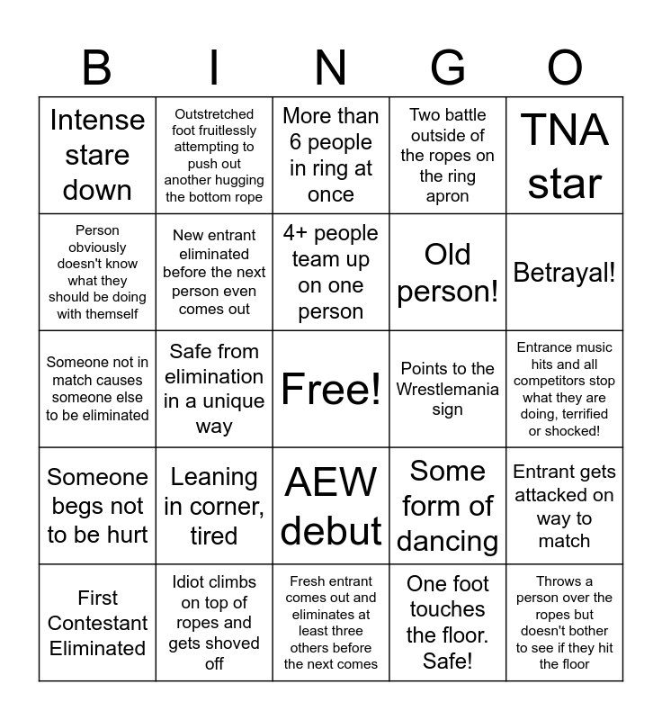 This bingo card has a free space and 27 words: Some form of dancing, Deliberately avoids the match. Cheater!, Old person!, Fresh entrant comes out and eliminates at least three others before the next comes, Person obviously doesn't know what they should be doing with themself, More than 6 people in ring at once, Outstretched foot fruitlessly attempting to push out another hugging the bottom rope, Someone begs not to be hurt, Points to the Wrestlemania sign, Entrant gets attacked on way to match, Someone not in match causes someone else to be eliminated, Two battle outside of the ropes on the ring apron, First Contestant Eliminated, Idiot climbs on top of ropes and gets shoved off, Betrayal!, Two people eliminated at once, New entrant eliminated before the next person even comes out, 4+ people team up on one person, Leaning in corner, tired, Intense stare down, Entrance music hits and all competitors stop what they are doing, terrified or shocked!, One foot touches the floor. Safe!, Safe from elimination in a unique way, Throws a person over the ropes but doesn't bother to see if they hit the floor, AEW debut, TNA star and Ring gets cleared down to 1.