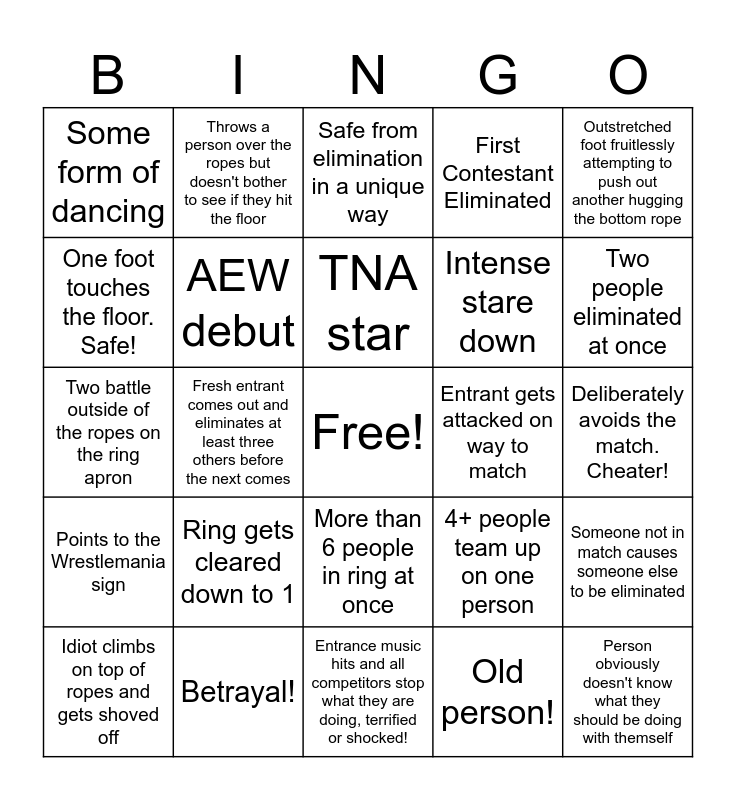 This bingo card has a free space and 27 words: 4+ people team up on one person, Leaning in corner, tired, Intense stare down, Entrance music hits and all competitors stop what they are doing, terrified or shocked!, One foot touches the floor. Safe!, Safe from elimination in a unique way, Throws a person over the ropes but doesn't bother to see if they hit the floor, Points to the Wrestlemania sign, Entrant gets attacked on way to match, Someone not in match causes someone else to be eliminated, Two battle outside of the ropes on the ring apron, First Contestant Eliminated, Idiot climbs on top of ropes and gets shoved off, Betrayal!, Two people eliminated at once, New entrant eliminated before the next person even comes out, AEW debut, TNA star, Ring gets cleared down to 1, Some form of dancing, Deliberately avoids the match. Cheater!, Old person!, Fresh entrant comes out and eliminates at least three others before the next comes, Person obviously doesn't know what they should be doing with themself, More than 6 people in ring at once, Outstretched foot fruitlessly attempting to push out another hugging the bottom rope and Someone begs not to be hurt.
