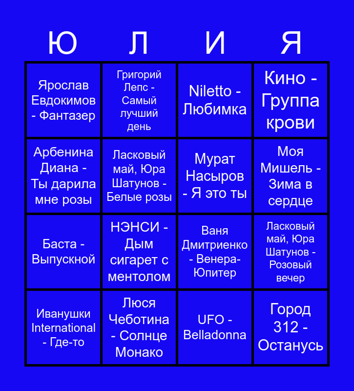 This bingo card has 24 words: Кай Метов - Position Number 2, Jazzdauren - Дарите женщинам цвет, Моя Мишель - Зима в сердце, ANNA ASTI - По барам, Арбенина Диана - Ты дарила мне розы, Ярослав Евдокимов - Фантазер, Ласковый май, Юра Шатунов - Белые розы, Григорий Лепс - Самый лучший день, Люся Чеботина - Солнце Монако, Zivert - Зеленые волны, Баста - Выпускной, Ваня Дмитриенко - Венера-Юпитер, Minelli - Rampampam, DaBro - Юность, Мурат Насыров - Я это ты, Анна Герман - Когда цвели сады, UFO - Belladonna, Niletto - Любимка, НЭНСИ - Дым сигарет с ментолом, Ласковый май, Юра Шатунов - Розовый вечер, Иванушки International - Где-то, Город 312 - Останусь, Кино - Группа крови and Валерий Меладзе - Сэра.