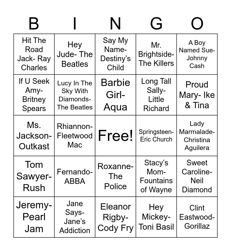 This bingo card has a free space and 48 words: Casey Jones- Grateful Dead, Clint Eastwood- Gorillaz, Come On Eileen- Dexys Midnight Runners, Eleanor Rigby- Cody Fry, Fernando- ABBA, Helena- My Chemical Romance, Hey Jude- The Beatles, Hey There Delilah- Plain White T’s, If U Seek Amy- Britney Spears, Judas- Lady Gaga, Lucy In The Sky With Diamonds- The Beatles, Mr. Brightside- The Killers, Sweet Caroline- Neil Diamond, Stacy’s Mom- Fountains of Wayne, Dirty Diana- Michael Jackson, Valerie- Mark Ronson, Amy Winehouse, Barbie Girl- Aqua, Springsteen- Eric Church, Tennessee Whiskey- Chris Stapleton, A Boy Named Sue- Johnny Cash, Rhiannon- Fleetwood Mac, Hey Mickey- Toni Basil, Hit The Road Jack- Ray Charles, Long Tall Sally- Little Richard, Ruby Don’t Take Your Love To Town- Kenny Rogers, Proud Mary- Ike & Tina, Jeremy- Pearl Jam, Mary Jane- Rick James, Roxanne- The Police, Tom Sawyer- Rush, Juno- Sabrina Carpenter, Hey Joe- Jimi Hendrix, Mary Jane’s Last Dance- Tom Petty and The Heartbreakers, A Message to You Rudy- The Specials, Jane Says- Jane’s Addiction, Sherry- Frankie Valli & The Four Seasons, Black Betty- Ram Jam, Lady Marmalade- Christina Aguilera, Mr. Crowley- Ozzy Osbourne, Mustang Sally- Wilson Pickett, Cotton Eye Joe- Rednex, What’s My Name?- Rihanna, Say My Name- Destiny’s Child, My Name Is- Eminem, Ms. Jackson- Outkast, Baba O’Riley- The Who, Bennie And The Jets- Elton John and Billie Jean- Michael Jackson.