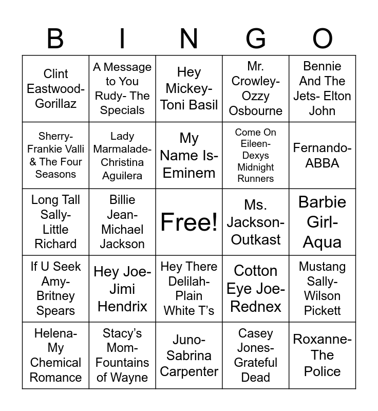 This bingo card has a free space and 48 words: Mary Jane- Rick James, Roxanne- The Police, Tom Sawyer- Rush, Juno- Sabrina Carpenter, Hey Joe- Jimi Hendrix, Mary Jane’s Last Dance- Tom Petty and The Heartbreakers, A Message to You Rudy- The Specials, Jane Says- Jane’s Addiction, Sherry- Frankie Valli & The Four Seasons, Black Betty- Ram Jam, Lady Marmalade- Christina Aguilera, Mr. Crowley- Ozzy Osbourne, Mustang Sally- Wilson Pickett, Cotton Eye Joe- Rednex, What’s My Name?- Rihanna, Say My Name- Destiny’s Child, My Name Is- Eminem, Ms. Jackson- Outkast, Baba O’Riley- The Who, Bennie And The Jets- Elton John, Billie Jean- Michael Jackson, Casey Jones- Grateful Dead, Clint Eastwood- Gorillaz, Come On Eileen- Dexys Midnight Runners, Eleanor Rigby- Cody Fry, Fernando- ABBA, Helena- My Chemical Romance, Hey Jude- The Beatles, Hey There Delilah- Plain White T’s, If U Seek Amy- Britney Spears, Judas- Lady Gaga, Lucy In The Sky With Diamonds- The Beatles, Mr. Brightside- The Killers, Sweet Caroline- Neil Diamond, Stacy’s Mom- Fountains of Wayne, Dirty Diana- Michael Jackson, Valerie- Mark Ronson, Amy Winehouse, Barbie Girl- Aqua, Springsteen- Eric Church, Tennessee Whiskey- Chris Stapleton, A Boy Named Sue- Johnny Cash, Rhiannon- Fleetwood Mac, Hey Mickey- Toni Basil, Hit The Road Jack- Ray Charles, Long Tall Sally- Little Richard, Ruby Don’t Take Your Love To Town- Kenny Rogers, Proud Mary- Ike & Tina and Jeremy- Pearl Jam.