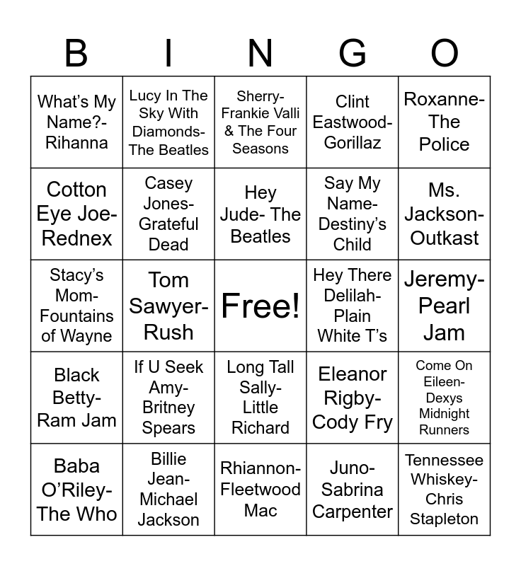 This bingo card has a free space and 48 words: Springsteen- Eric Church, Tennessee Whiskey- Chris Stapleton, A Boy Named Sue- Johnny Cash, Rhiannon- Fleetwood Mac, If U Seek Amy- Britney Spears, Judas- Lady Gaga, Lucy In The Sky With Diamonds- The Beatles, Mr. Brightside- The Killers, Cotton Eye Joe- Rednex, Hit The Road Jack- Ray Charles, Casey Jones- Grateful Dead, Clint Eastwood- Gorillaz, Come On Eileen- Dexys Midnight Runners, Eleanor Rigby- Cody Fry, Fernando- ABBA, Helena- My Chemical Romance, Hey Jude- The Beatles, Hey There Delilah- Plain White T’s, Mary Jane- Rick James, Roxanne- The Police, Tom Sawyer- Rush, Juno- Sabrina Carpenter, What’s My Name?- Rihanna, Say My Name- Destiny’s Child, My Name Is- Eminem, Ms. Jackson- Outkast, Baba O’Riley- The Who, Hey Mickey- Toni Basil, Long Tall Sally- Little Richard, Black Betty- Ram Jam, Lady Marmalade- Christina Aguilera, Mr. Crowley- Ozzy Osbourne, Mustang Sally- Wilson Pickett, Bennie And The Jets- Elton John, Billie Jean- Michael Jackson, Ruby Don’t Take Your Love To Town- Kenny Rogers, Proud Mary- Ike & Tina, Jeremy- Pearl Jam, Hey Joe- Jimi Hendrix, Mary Jane’s Last Dance- Tom Petty and The Heartbreakers, A Message to You Rudy- The Specials, Jane Says- Jane’s Addiction, Sherry- Frankie Valli & The Four Seasons, Sweet Caroline- Neil Diamond, Stacy’s Mom- Fountains of Wayne, Dirty Diana- Michael Jackson, Valerie- Mark Ronson, Amy Winehouse and Barbie Girl- Aqua.