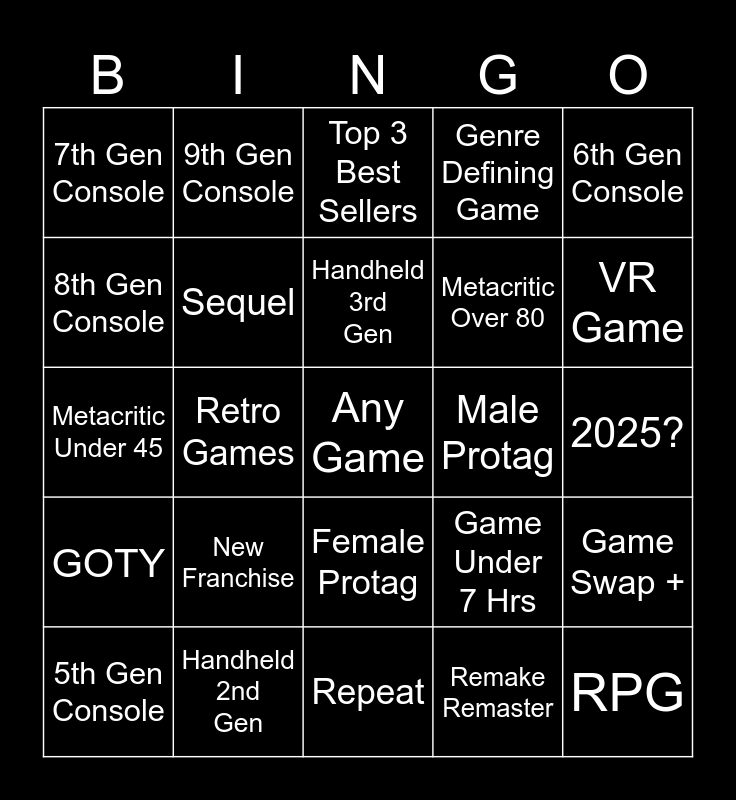 This bingo card has a free space and 24 words: New Franchise, Handheld 2nd Gen, Handheld 3rd Gen, 5th Gen Console, 6th Gen Console, 7th Gen Console, 8th Gen Console, 9th Gen Console, Male Protag, Female Protag, Metacritic Over 80, Metacritic Under 45, Game Under 7 Hrs, Game Swap +, Sequel, Remake Remaster, 2025?, Top 3 Best Sellers, VR Game, Retro Games, RPG, GOTY, Genre Defining Game and Repeat.