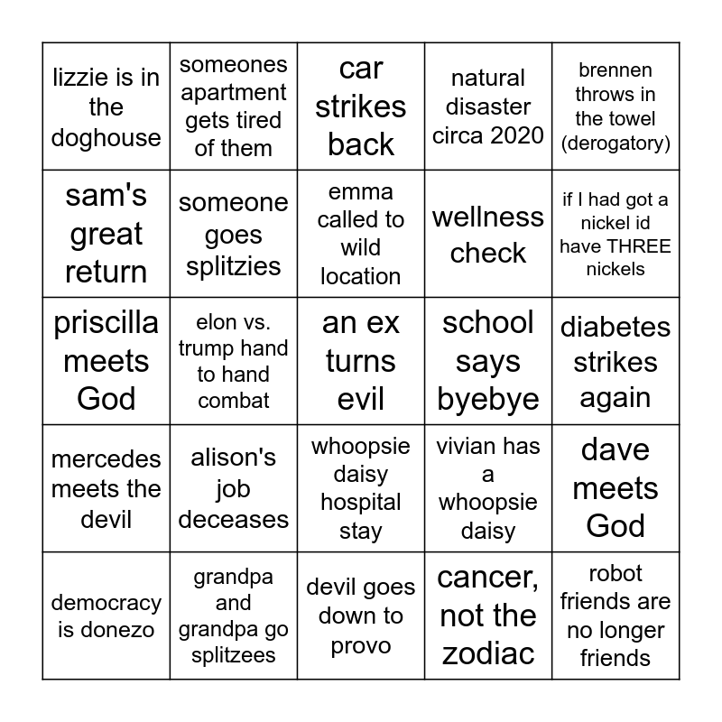 This bingo card has a free space and 24 words: alison's job deceases, grandpa and grandpa go splitzees, emma called to wild location, democracy is donezo, brennen throws in the towel (derogatory), lizzie is in the doghouse, sam's great return, someones apartment gets tired of them, school says byebye, whoopsie daisy hospital stay, wellness check, priscilla meets God, vivian has a whoopsie daisy, dave meets God, someone goes splitzies, cancer, not the zodiac, diabetes strikes again, car strikes back, if I had got a nickel id have THREE nickels, elon vs. trump hand to hand combat, robot friends are no longer friends, mercedes meets the devil, natural disaster circa 2020 and devil goes down to provo.