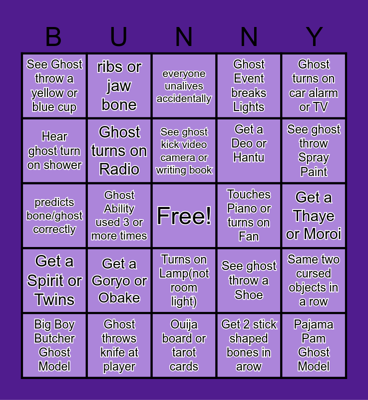 This bingo card has a free space and 64 words: Ghost knocks photo off wall, Snow weather, Foot or Hand bone, Same two cursed objects in a row, Mannequin or Rocking Chair gets moved, Pull a Death or Devil Tarot Card, ribs or jaw bone, Turns off power breaker 2 or more times, See ghost kick video camera or writing book, Changes favorite room 2 or more times, Turns on Lamp(not room light), Ghost sings 'Ring Around the Rosie', Get a Thaye or Moroi, Ghost turns on car alarm or TV, Get a Phantom or Oni, Hear ghost turn on shower, Ghost Ability used 3 or more times, See Ghost throw a yellow or blue cup, someone gets face full of ghost crotch, Get a Deo or Hantu, Get a Goryo or Obake, Get a Spirit or Twins, Ghost Event breaks Lights, Get a Polty or Banshee, Skull or Voldy's wand bone, Bone is in Utility Room or Garage, Someone unalives in anyway, Get a Demon or Yokai, Granny Ghost Model, Teddy Bear giggle or bear has no face, Ghost is 'young' with spirit box, Get a Mimic or Wraith, Hip or Femur bone, 'Red Light' Ghost Event, See ghost throw Spray Paint, Big Boy Butcher Ghost Model, Baseball Bat Boy Ghost Model, Get 2 stick shaped bones in arow, Farmer Fred Ghost Model, Ghost turns on Radio, predicts bone/ghost correctly, Touches Piano or turns on Fan, Nekkid Ned Ghost Model, Everyone guesses the wrong ghost, Onion Head Girl Ghost Model, Pajama Pam Ghost Model, Ghost throws knife at player, someone takes a 2-star ghost photo, See ghost throw a Shoe, Axe Man Ghost Model, Dirty water, One-star disturbed salt pic, Ouija board or tarot cards, Music box or birthday cake, ghost is close to busting, chihuahua walking ghost, everyone unalives accidentally, no good linda, same three ghost models in a row, Pull a high priestess (no fool), Calendar unalives due to no lighter, Maddie forgets to flush all toilets, Unsuspected mimic and Ghost spawns behind you after saying "from behind".