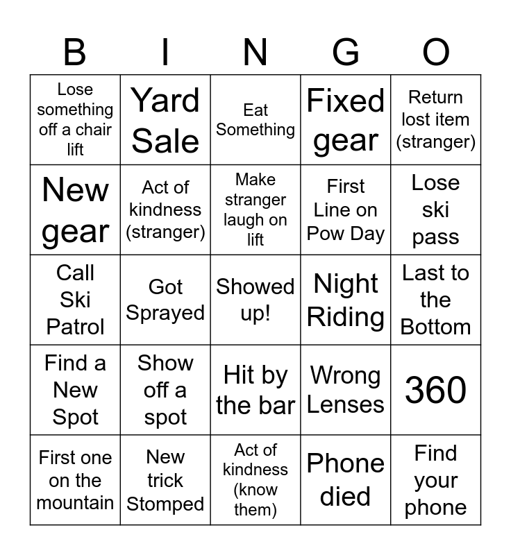 This bingo card has a free space and 50 words: Photo for Randoms, New trick Stomped, Cheers from Chair Lift, First to the Bottom, Last to the Bottom, White Wash, Yard Sale, Hit a rail, First Line on Pow Day, Hike, Lose something off a chair lift, Act of kindness (stranger), Act of kindness (know them), Phone died, Lost Phone, Lost Earbud, Got Sprayed, Make stranger laugh on lift, Retrieve lost item (for yourself), Return lost item (stranger), Call Ski Patrol, Drink Water, Eat Something, Night Riding, Drove people, Find a New Spot, Show off a spot, Broke gear, Fixed gear, 360, Forgot it's a Blackout Day, Bleed, Handwarmers, Bring food to share, Apres, First one on the mountain, Help a kid, Teach something, Went into water, Lose ski pass, Stopped by a scanner, Stop/Slow the Lift, Hit by the bar, Take the single line, Find your phone, New gear, Plan a day, 4 o'clock home, Wrong Lenses and Caught the rope drop.