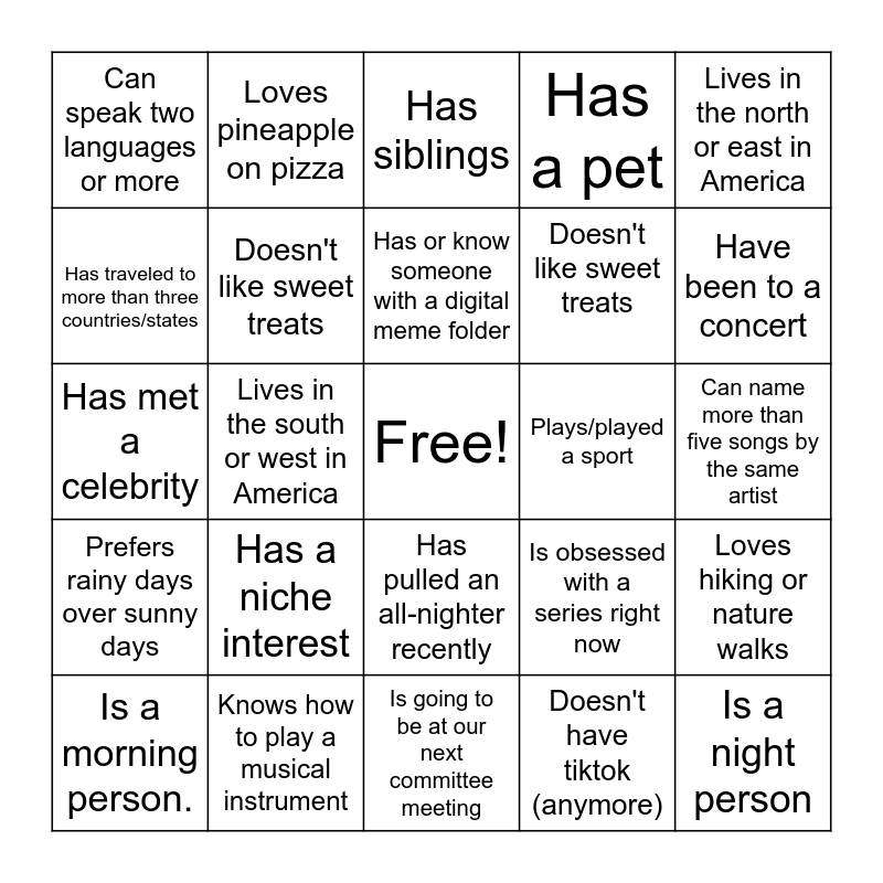 This bingo card has a free space and 24 words: Has a niche interest, Knows how to play a musical instrument, Has or know someone with a digital meme folder, Is a morning person., Lives in the north or east in America, Can speak two languages or more, Has traveled to more than three countries/states, Loves pineapple on pizza, Plays/played a sport, Has pulled an all-nighter recently, Doesn't like sweet treats, Has met a celebrity, Is obsessed with a series right now, Loves hiking or nature walks, Doesn't like sweet treats, Doesn't have tiktok (anymore), Can name more than five songs by the same artist, Has siblings, Have been to a concert, Lives in the south or west in America, Is a night person, Prefers rainy days over sunny days, Has a pet and Is going to be at our next committee meeting.