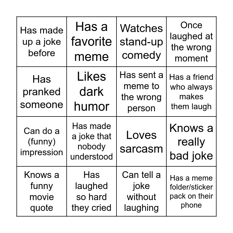 This bingo card has 16 words: Has laughed so hard they cried, Knows a really bad joke, Watches stand-up comedy, Has made up a joke before, Can do a (funny) impression, Has a favorite meme, Loves sarcasm, Can tell a joke without laughing, Has pranked someone, Likes dark humor, Knows a funny movie quote, Once laughed at the wrong moment, Has made a joke that nobody understood, Has a friend who always makes them laugh, Has sent a meme to the wrong person and Has a meme folder/sticker pack on their phone.