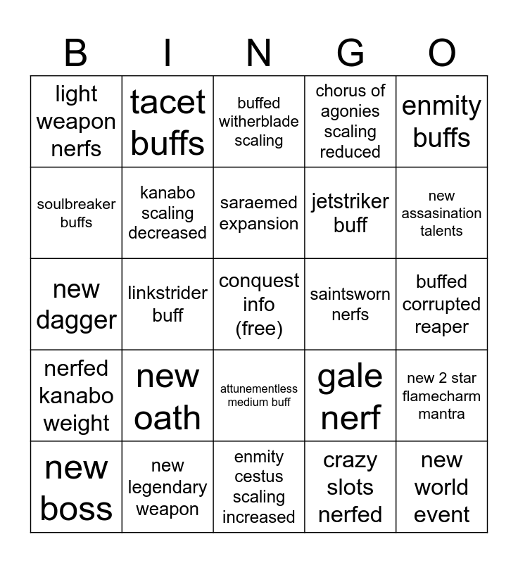 This bingo card has a free space and 24 words: new oath, new legendary weapon, saraemed expansion, new boss, enmity buffs, light weapon nerfs, soulbreaker buffs, tacet buffs, saintsworn nerfs, attunementless medium buff, jetstriker buff, new dagger, gale nerf, new 2 star flamecharm mantra, kanabo scaling decreased, crazy slots nerfed, buffed corrupted reaper, buffed witherblade scaling, new assasination talents, linkstrider buff, new world event, nerfed kanabo weight, chorus of agonies scaling reduced and enmity cestus scaling increased.