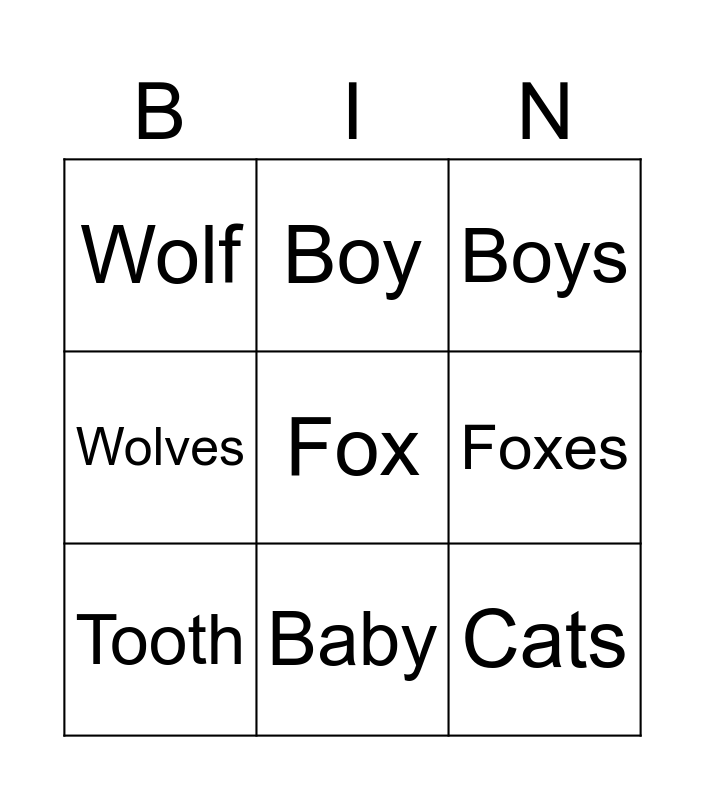 This bingo card has 12 words: Cat, Cats, Fox, Foxes, Boy, Boys, Baby, Babies, Wolf, Wolves, Tooth and Teeth.