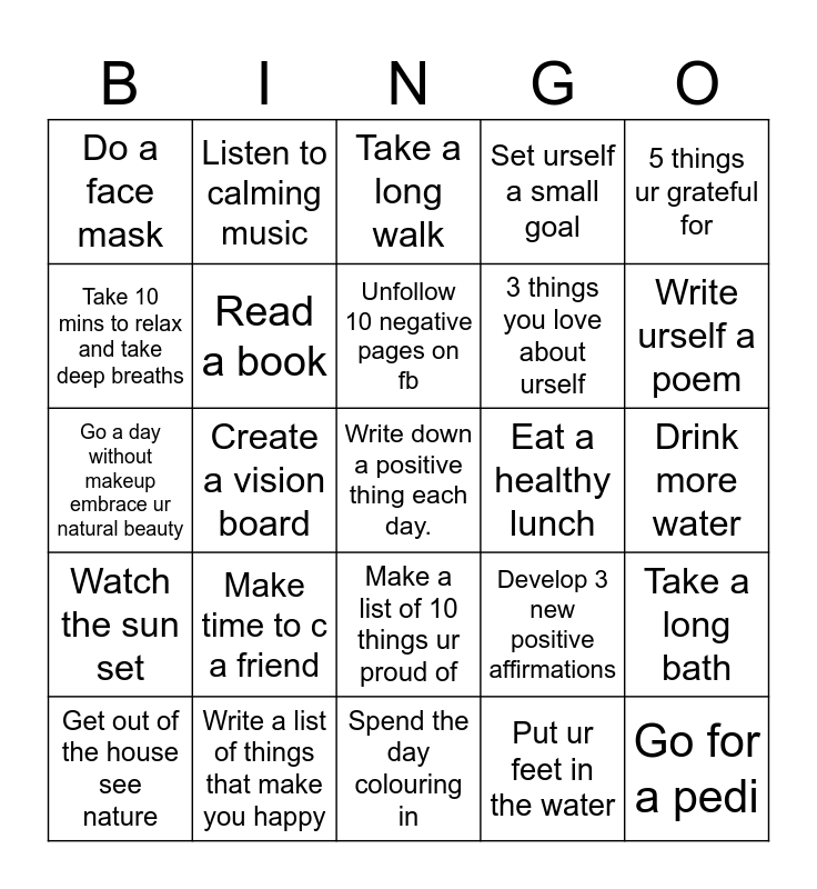 This bingo card has 28 words: Take a long bath, Pay it forward, 3 things you love about urself, Put ur feet in the water, Take 10 mins to relax and take deep breaths, Take a long walk, Listen to calming music, Watch the sun set, Eat a healthy lunch, Get out of the house see nature, Go a day without makeup embrace ur natural beauty, Set urself a small goal, Write a list of things that make you happy, Spend the day colouring in, Write urself a poem, Buy flowers, Make time to c a friend, Read a book, Unfollow 10 negative pages on fb, Make a list of 10 things ur proud of, Do a face mask, Go for a pedi, Write down a positive thing each day., Create a vision board, Drink more water, Develop 3 new positive affirmations, 5 things ur grateful for and Follow a stretching video..