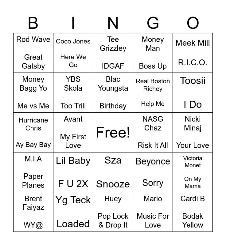 This bingo card has a free space and 24 words: Lil Baby F U 2X, Yg Teck Loaded, Blac Youngsta Birthday, Brent Faiyaz WY@, Meek Mill R.I.C.O., Rod Wave Great Gatsby, Money Bagg Yo Me vs Me, Coco Jones Here We Go, NASG Chaz Risk It All, Sza Snooze, Real Boston Richey Help Me, Hurricane Chris Ay Bay Bay, Beyonce Sorry, Victoria Monet On My Mama, YBS Skola Too Trill, Mario Music For Love, Nicki Minaj Your Love, Tee Grizzley IDGAF, Toosii I Do, Avant My First Love, Cardi B Bodak Yellow, M.I.A Paper Planes, Money Man Boss Up and Huey Pop Lock & Drop It.