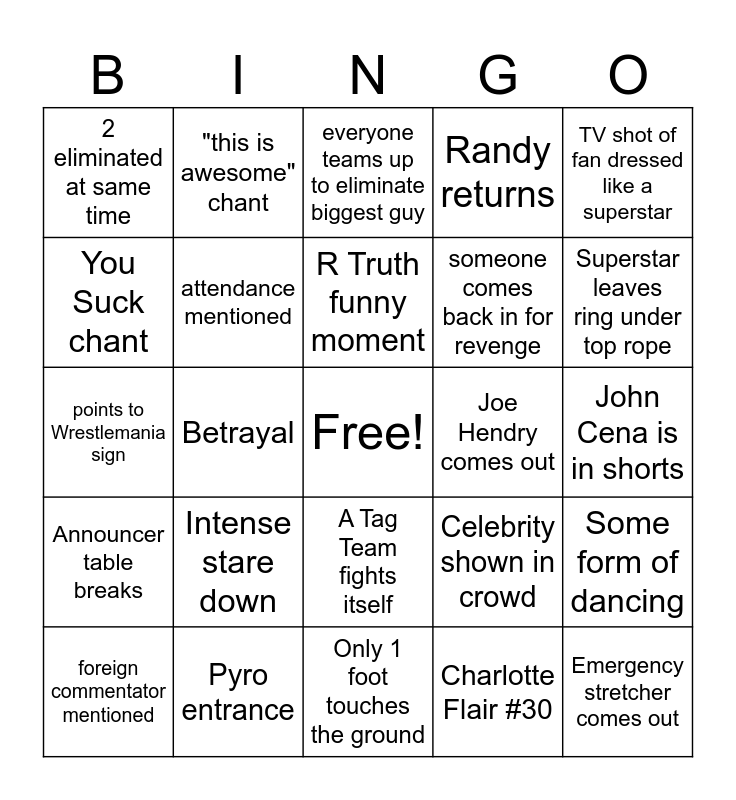 This bingo card has a free space and 26 words: CM Punk chant, Intense stare down, Only 1 foot touches the ground, Charlotte Flair #30, Superstar leaves ring under top rope, 2 eliminated at same time, "this is awesome" chant, everyone teams up to eliminate biggest guy, someone comes back in for revenge, Some form of dancing, points to Wrestlemania sign, Betrayal, Celebrity shown in crowd, Emergency stretcher comes out, Announcer table breaks, Superstar gets beat up before entering ring, R Truth funny moment, Joe Hendry comes out, TV shot of fan dressed like a superstar, foreign commentator mentioned, attendance mentioned, A Tag Team fights itself, Randy returns, John Cena is in shorts, You Suck chant and Pyro entrance.