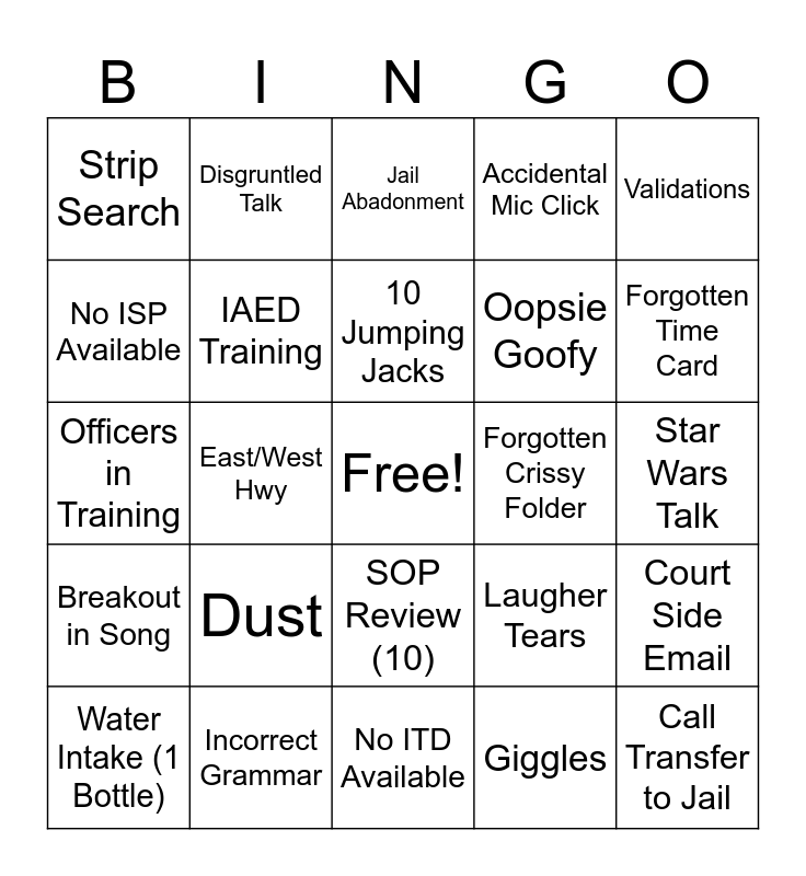 This bingo card has a free space and 39 words: Key Checkout, Nickname Used, Equipment Failure, IAED Training, Water Intake (1 Bottle), SOP Review (10), 10 Jumping Jacks, Random Movie Quote, Validations, Breakout in Song, East/West Hwy, Accidental Mic Click, Call Transfer to Jail, Star Wars Talk, Forgotten Crissy Folder, Dust, Front Door Open Requests, Strip Search, Window Visits by Officer (5min), Laugher Tears, No ISP Available, No ITD Available, Oopsie Goofy, Forgotten Time Card, Smelly Public, Frequent Flyer, Emails from Admin, Sports Talk, Vehicle Talk, Disgruntled Talk, Grumpy Coworkers, Random Weather Talk, Jail Abadonment, Incorrect Grammar, Giggles, DHW Email, Court Side Email, Officers in Training and Officer Call Out.
