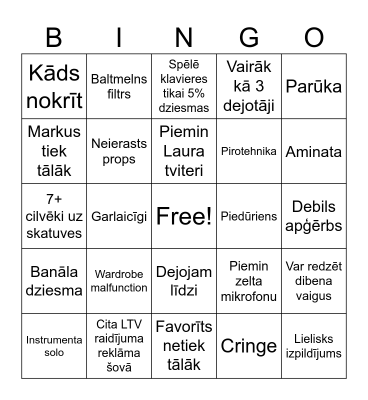This bingo card has a free space and 31 words: Favorīts netiek tālāk, Plaģiāts, Garlaicīgi, WTF, Kāds nokrīt, Spēlē klavieres tikai 5% dziesmas, Neierasts props, Piemin zelta mikrofonu, Piedūriens, Cringe, Debils apģērbs, Lielisks izpildījums, Off key, Pēdējā brīdī iesniedz dziesmu, Aminata, Marija Naumova, Var redzēt dibena vaigus, Wardrobe malfunction, Banāla dziesma, Dejojam līdzi, Parūka, Netipisks mūzikas instruments, Instrumenta solo, Baltmelns filtrs, Pirotehnika, Markus tiek tālāk, Vairāk kā 3 dejotāji, 7+ cilvēki uz skatuves, Cita LTV raidījuma reklāma šovā, Piemin Laura tviteri and Vadītājs nofeilo.
