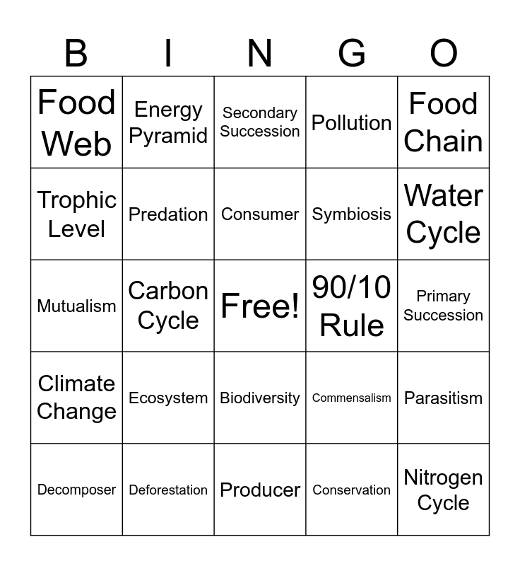 This bingo card has a free space and 25 words: Ecosystem, Producer, Consumer, Decomposer, Food Chain, Food Web, Trophic Level, Energy Pyramid, 90/10 Rule, Biodiversity, Symbiosis, Mutualism, Commensalism, Parasitism, Predation, Competition, Primary Succession, Secondary Succession, Water Cycle, Carbon Cycle, Nitrogen Cycle, Deforestation, Climate Change, Pollution and Conservation.