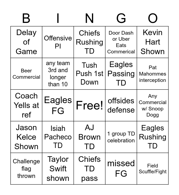 This bingo card has a free space and 24 words: Isiah Pacheco TD, Taylor Swift shown, Tush Push 1st Down, Challenge flag thrown, Kevin Hart Shown, Delay of Game, Beer Commercial, Offensive PI, offsides defense, AJ Brown TD, Eagles Passing TD, Coach Yells at ref, 1 group TD celebration, Eagles Rushing TD, any team 3rd and longer than 10, missed FG, Any Commercial w/ Snoop Dogg, Chiefs Rushing TD, Pat Mahommes interception, Eagles FG, Field Scuffle/Fight, Jason Kelce Shown, Door Dash or Uber Eats Commerical and Chiefs TD pass.