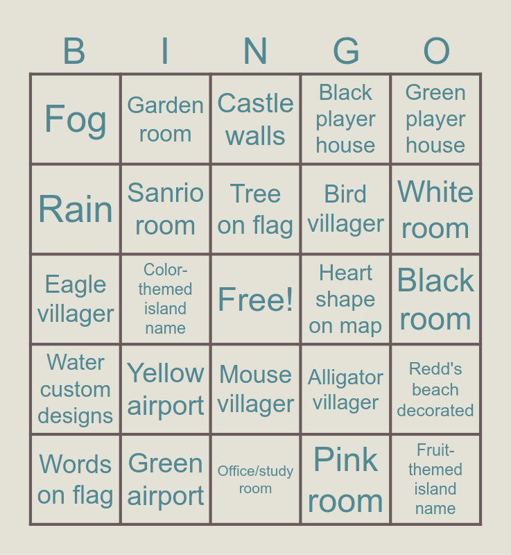 This bingo card has a free space and 24 words: Yellow airport, Green airport, Tree on flag, Words on flag, Green player house, Fog, Rain, Garden room, Heart shape on map, Mouse villager, Bird villager, Eagle villager, Alligator villager, Redd's beach decorated, Sanrio room, Pink room, Black room, Castle walls, White room, Color-themed island name, Fruit-themed island name, Water custom designs, Black player house and Office/study room.