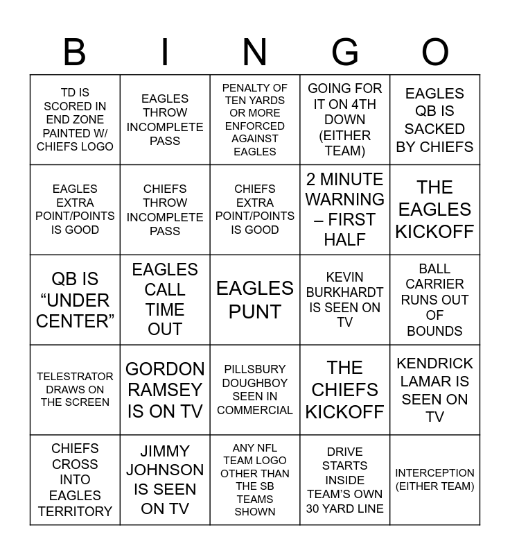 This bingo card has 75 words: FIVE YARD PENALTY ENFORCED AGAINST EAGLES, FIVE YARD PENALTY ENFORCED AGAINST CHIEFS, PENALTY OF TEN YARDS OR MORE ENFORCED AGAINST EAGLES, PENALTY OF TEN YARDS OR MORE ENFORCED AGAINST CHIEFS, CHIEFS RUNNING PLAY LOSES YARDAGE, EAGLES RUNNING PLAY LOSES YARDAGE, CHIEFS GET A FIRST DOWN, EAGLES GET A FIRST DOWN, CHIEFS TOUCHDOWN, EAGLES TOUCHDOWN, INTERCEPTION (EITHER TEAM), FIELD GOAL IS GOOD (EITHER TEAM), CHIEFS EXTRA POINT/POINTS IS GOOD, EAGLES EXTRA POINT/POINTS IS GOOD, CHIEFS CALL TIME OUT, EAGLES CALL TIME OUT, CHIEFS PUNT, EAGLES PUNT, CHIEFS QB IS SACKED BY EAGLES, EAGLES QB IS SACKED BY CHIEFS, QB IS IN SHOTGUN FORMATION, QB IS “UNDER CENTER”, CHIEFS THROW INCOMPLETE PASS, EAGLES THROW INCOMPLETE PASS, GOING FOR IT ON 4TH DOWN (EITHER TEAM), CHIEFS COMPLETE A PASS, EAGLES COMPLETE A PASS, TOUCHBACK, EITHER TEAM PASSES FOR 100 OR MORE TOTAL YARDS, EITHER TEAM PASSES FOR 150 OR MORE TOTAL YARDS, A RUSH OF FIVE YARDS OR MORE, IT’S HALFTIME, PENALTY IS DECLINED, THE CHIEFS KICKOFF, THE EAGLES KICKOFF, 2 MINUTE WARNING – FIRST HALF, 2 MINUTE WARNING – SECOND HALF, EAGLES IN THE RED ZONE, BALL CARRIER RUNS OUT OF BOUNDS, DRIVE STARTS INSIDE TEAM’S OWN 30 YARD LINE, CHIEFS IN THE RED ZONE, CHIEFS REACH 9 POINTS OR MORE, EAGLES REACH 9 POINTS OR MORE, CHIEFS REACH 13 POINTS OR MORE, EAGLES REACH 13 POINTS OR MORE, EAGLES CROSS INTO CHIEFS TERRITORY, CHIEFS CROSS INTO EAGLES TERRITORY, TD IS SCORED IN END ZONE PAINTED W/ CHIEFS LOGO, TD IS SOCRED IN END ZONE PAINTED W/ EAGLES LOGO, EAGLES HAVE THE LEAD, CHIEFS HAVE THE LEAD, PILLSBURY DOUGHBOY SEEN IN COMMERCIAL, BILLY CRYSTAL SEEN IN COMMERCIAL, ANGEL SOFT TOILET PAPER COMMERCIAL, BUD LIGHT COMMERICAL, TACO BELL COMMERCIAL, TWIX COMMERCIAL, STELLA ARTOIS COMMERCIAL, PEYTON MANNING IS ON TV, UBER EATS COMMERCIAL, GORDON RAMSEY IS ON TV, COMMERCIAL FOR A FOX SHOW, DREW BARRYMORE IS ON TV, NATIONAL ANTHEM IS SUNG, TOM BRADY IS SEEN ON TV, KEVIN BURKHARDT IS SEEN ON TV, EAGLES COACH IS ON TV, CHIEFS COACH IS ON TV, SIDELINE REPORTER IS ON TV, KENDRICK LAMAR IS SEEN ON TV, TELESTRATOR DRAWS ON THE SCREEN, JIMMY JOHNSON IS SEEN ON TV, OVERHEAD SHOT OF STADIUM, ANY NFL TEAM LOGO OTHER THAN THE SB TEAMS SHOWN and TAYLOR SWIFT IS SEEN ON TV.