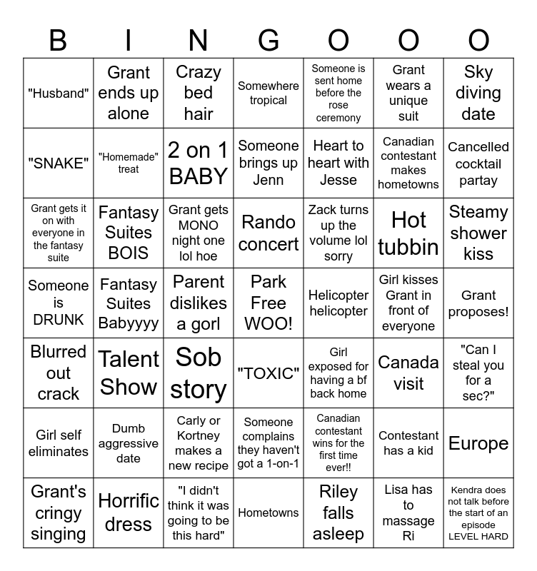 This bingo card has a free space and 48 words: Canadian contestant wins for the first time ever!!, Canadian contestant makes hometowns, Hometowns, Fantasy Suites Babyyyy, Grant gets MONO night one lol hoe, Grant proposes!, Grant ends up alone, Horrific dress, Grant wears a unique suit, "TOXIC", Sky diving date, Somewhere tropical, Hot tubbin, Zack turns up the volume lol sorry, Girl self eliminates, Girl kisses Grant in front of everyone, "SNAKE", Cancelled cocktail partay, Contestant has a kid, Someone is sent home before the rose ceremony, Heart to heart with Jesse, Parent dislikes a gorl, "Husband", "Homemade" treat, Europe, 2 on 1 BABY, Steamy shower kiss, Grant's cringy singing, Rando concert, Fantasy Suites BOIS, Lisa has to massage Ri, Helicopter helicopter, "Can I steal you for a sec?", Dumb aggressive date, Someone is DRUNK, Girl exposed for having a bf back home, Canada visit, Grant gets it on with everyone in the fantasy suite, Sob story, Carly or Kortney makes a new recipe, Blurred out crack, Kendra does not talk before the start of an episode LEVEL HARD, Crazy bed hair, "I didn't think it was going to be this hard", Someone brings up Jenn, Someone complains they haven't got a 1-on-1, Talent Show and Riley falls asleep.