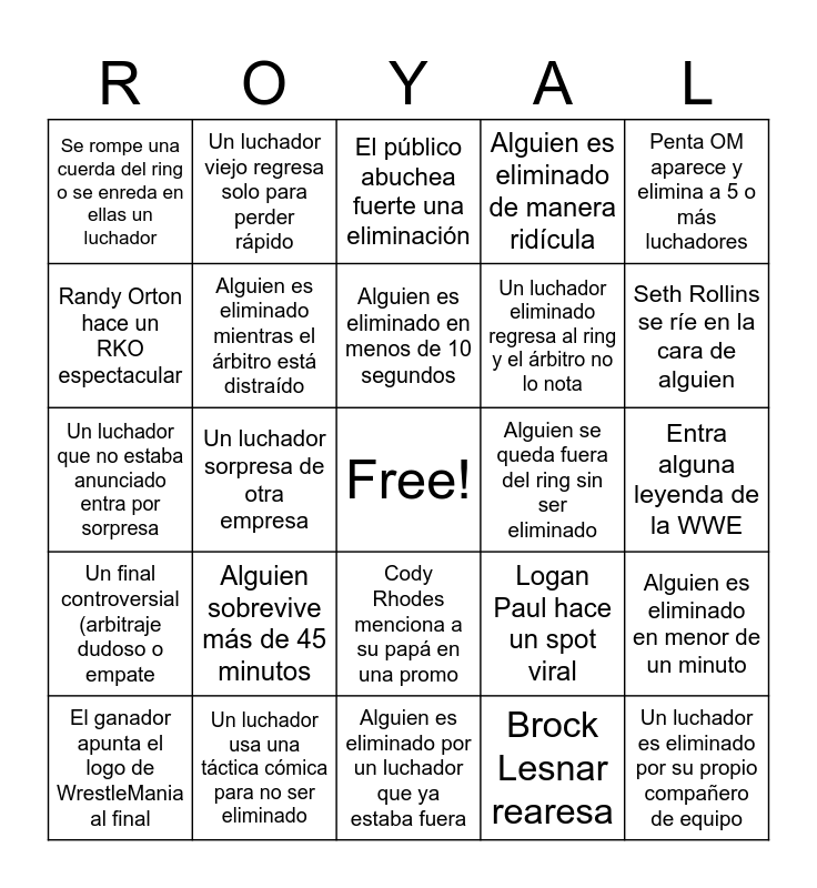 This bingo card has a free space and 24 words: Alguien sobrevive más de 45 minutos, Un luchador usa una táctica cómica para no ser eliminado, Alguien es eliminado en menos de 10 segundos, El ganador apunta el logo de WrestleMania al final, Penta OM aparece y elimina a 5 o más luchadores, Se rompe una cuerda del ring o se enreda en ellas un luchador, Randy Orton hace un RKO espectacular, Un luchador viejo regresa solo para perder rápido, Alguien se queda fuera del ring sin ser eliminado, Cody Rhodes menciona a su papá en una promo, Un luchador eliminado regresa al ring y el árbitro no lo nota, Un luchador que no estaba anunciado entra por sorpresa, Logan Paul hace un spot viral, Alguien es eliminado en menor de un minuto, Alguien es eliminado mientras el árbitro está distraído, Brock Lesnar rearesa, Entra alguna leyenda de la WWE, El público abuchea fuerte una eliminación, Seth Rollins se ríe en la cara de alguien, Un luchador sorpresa de otra empresa, Un luchador es eliminado por su propio compañero de equipo, Un final controversial (arbitraje dudoso o empate, Alguien es eliminado de manera ridícula and Alguien es eliminado por un luchador que ya estaba fuera.