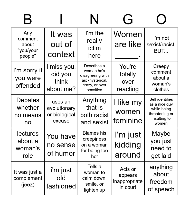 This bingo card has a free space and 24 words: You have no sense of humor, i'm just old fashioned, Describes a woman he's disagreeing with as: -hysterical, crazy, or over sensitive, It was just a complement (jeez), I'm not sexist/racist, BUT..., Any comment about "you/your people", I'm sorry if you were offended, It was out of context, I like my women feminine, Blames his creepiness on a woman for being too hot, You're totally over reacting, Debates whether no means no, I'm just kidding around, Maybe you just need to get laid, I miss you, did you think about me?, Acts or appears inappropriate in court, Self identifies as a nice guy while being threatening or insulting to women, I'm the real victim here, Creepy comment about a woman's clothes, uses an evolutionary or biological excuse, anything about freedom of speech, lectures about a woman's role, Women are like _____. and Tells a woman to calm down, smile, or lighten up.