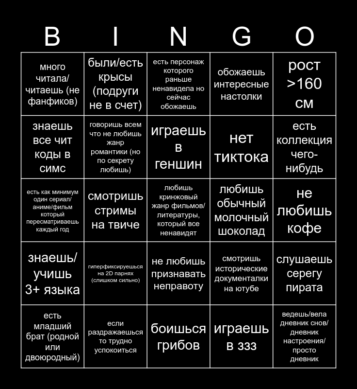 This bingo card has 25 words: гиперфиксируешься на 2D парнях (слишком сильно), боишься грибов, играешь в геншин, есть младший брат (родной или двоюродный), рост >160 см, много читала/читаешь (не фанфиков), знаешь все чит коды в симс, были/есть крысы (подруги не в счет), любишь обычный молочный шоколад, не любишь признавать неправоту, нет тиктока, есть как минимум один сериал/аниме/фильм который пересматриваешь каждый год, смотришь исторические документалки на ютубе, слушаешь серегу пирата, говоришь всем что не любишь жанр романтики (но по секрету любишь), ведешь/вела дневник снов/дневник настроения/просто дневник, не любишь кофе, есть персонаж которого раньше ненавидела но сейчас обожаешь, есть коллекция чего-нибудь, смотришь стримы на твиче, любишь кринжовый жанр фильмов/литературы, который все ненавидят, если раздражаешься то трудно успокоиться, знаешь/учишь 3+ языка, обожаешь интересные настолки and играешь в ззз.