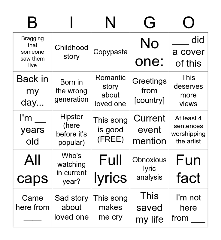 This bingo card has a free space and 24 words: Who's watching in current year?, Sad story about loved one, Romantic story about loved one, Came here from ____, ___ did a cover of this, Bragging that someone saw them live, Back in my day..., Childhood story, Current event mention, Full lyrics, Greetings from [country], I'm __ years old, Obnoxious lyric analysis, Fun fact, Born in the wrong generation, This saved my life, At least 4 sentences worshipping the artist, Copypasta, This deserves more views, Hipster (here before it's popular), I'm not here from ___, All caps, No one: and This song makes me cry.