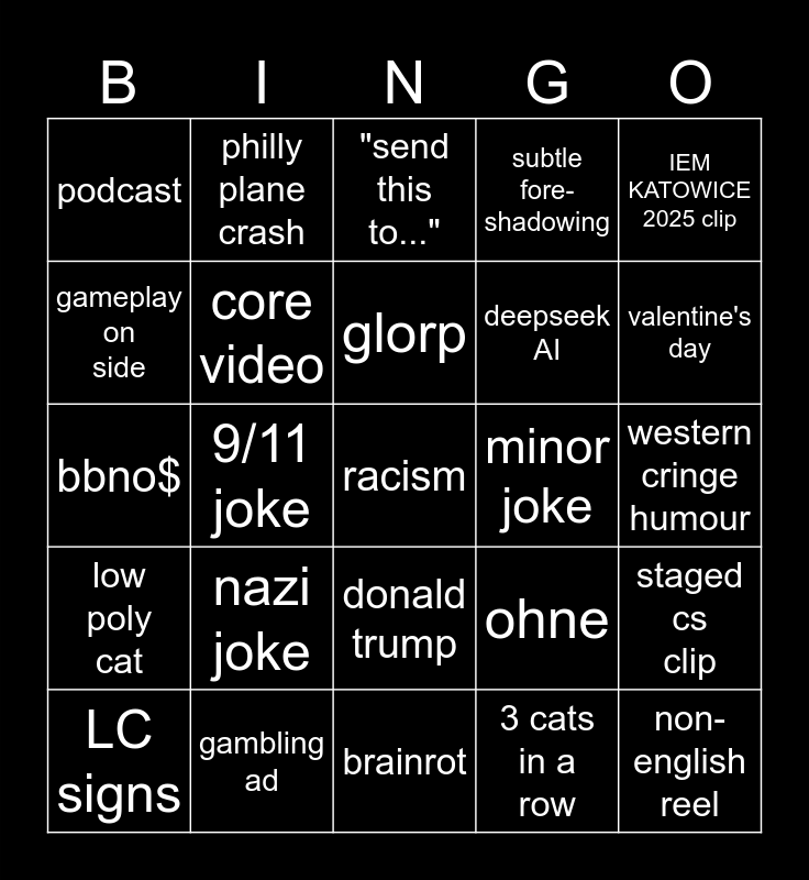 This bingo card has a free space and 24 words: nazi joke, gambling ad, glorp, LC signs, IEM KATOWICE 2025 clip, podcast, gameplay on side, philly plane crash, minor joke, donald trump, deepseek AI, bbno$, ohne, staged cs clip, core video, 3 cats in a row, western cringe humour, "send this to...", valentine's day, 9/11 joke, non-english reel, low poly cat, subtle fore-shadowing and brainrot.