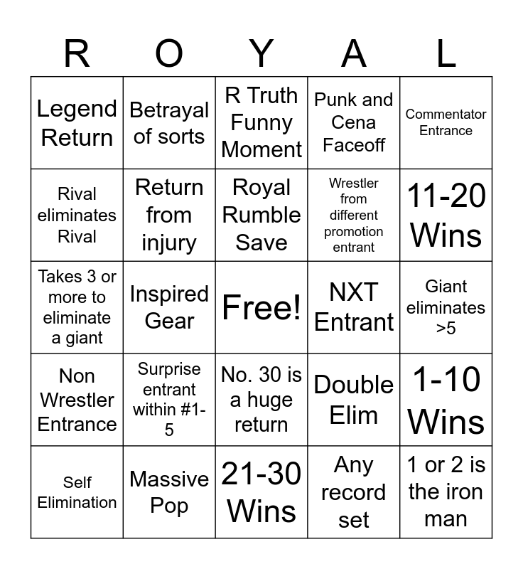 This bingo card has a free space and 24 words: Surprise entrant within #1-5, Massive Pop, Royal Rumble Save, Self Elimination, Commentator Entrance, Legend Return, Rival eliminates Rival, Betrayal of sorts, NXT Entrant, No. 30 is a huge return, Wrestler from different promotion entrant, Takes 3 or more to eliminate a giant, Double Elim, 1-10 Wins, Return from injury, Any record set, Giant eliminates >5, R Truth Funny Moment, 11-20 Wins, Inspired Gear, 1 or 2 is the iron man, Non Wrestler Entrance, Punk and Cena Faceoff and 21-30 Wins.